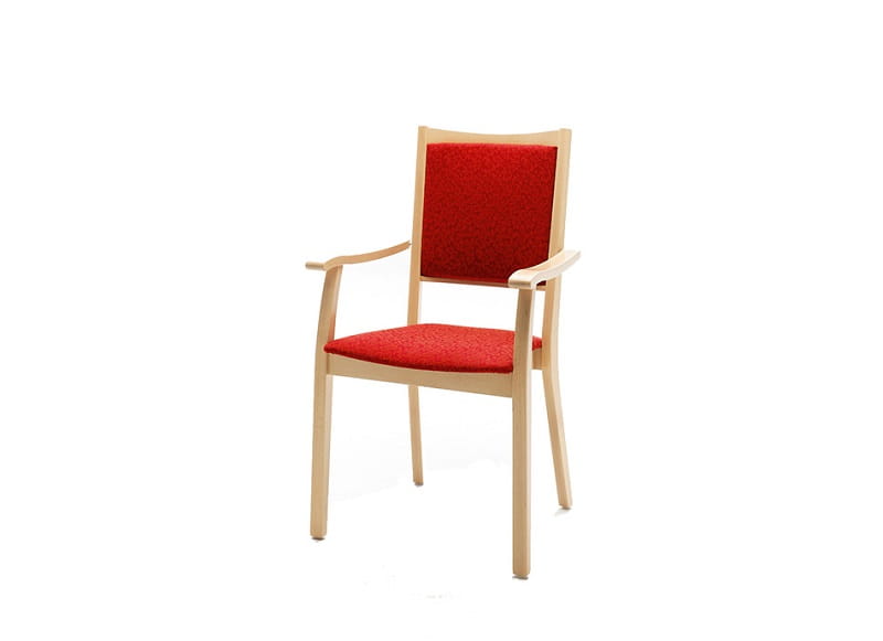 Stoel met langere rugleuning, armleuning en rechte stollen. Het gestoffeerde zit- en ruggedeelte zorgt voor een hoog zitcomfort. Het stabiele onderstel is van gelakt, massief hout. Bovendien kan de stoel worden gestapeld.