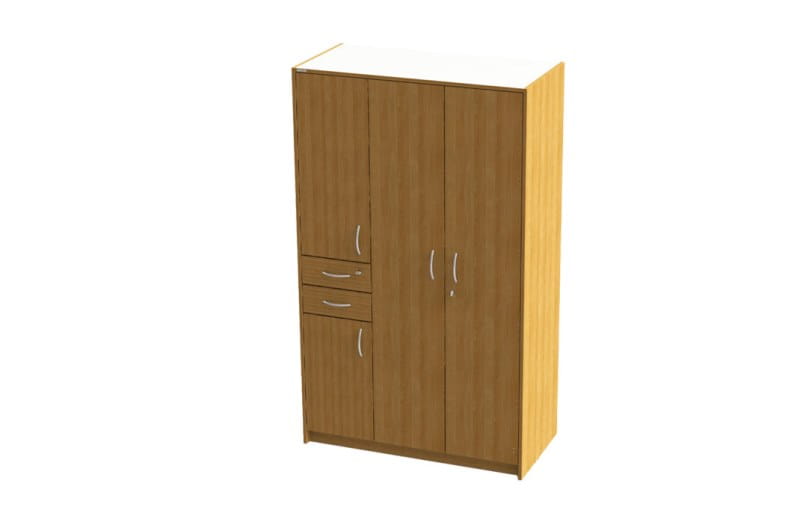 Eenpersoonskast met 3 deuren, kledingroede en legplanken. De kast biedt een royale opbergruimte en is door de 128 mm brede segmentbooggrepen voor de bewoners altijd goed te bedienen. De geïntegreerde, ingeboorde dempers verlagen het geluidsniveau tijdens het sluiten van de deuren. Er bestaat een mogelijkheid om een waardevak op verschillende hoogtes in te bouwen. Zodoende hebben ook mensen in een rolstoel optimale toegang.